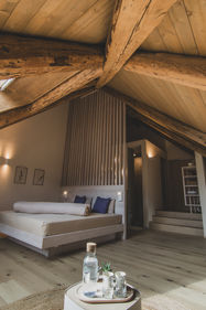 Ideal für alle Familien oder Omi und Opi, welche ein Zimmer ohne Treppen bevorzugen. Unser Alles-Könner-Zimmer: zu zweit, mit kleinen oder großen Kids - alles ist hier möglich. Doppelbett mit Rückwand als Raumtrenner; Nischenbett mit Queensize-Matratze in der Dachschräge für bis zu zwei Kinder; auf Wunsch zusätzliches Montessori-Bodenbett; ein offener Badbereich und zwei riesige Panorama-Dachfenster, um in die Sterne zu blicken. Und alles auf einer Ebene.