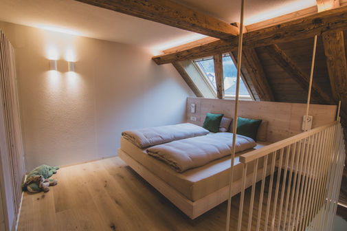Ideale per famiglie con più bambini – su 2 livelli; zona notte collegata da una scala sospesa, letto matrimoniale per i genitori e nicchia con letto matrimoniale per i bambini; bagno aperto e zona giorno aperta con divano, sedia a dondolo e mobili relax.